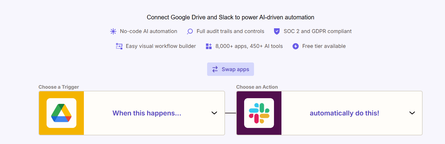 A Google Drive trigger results in an action in Slack