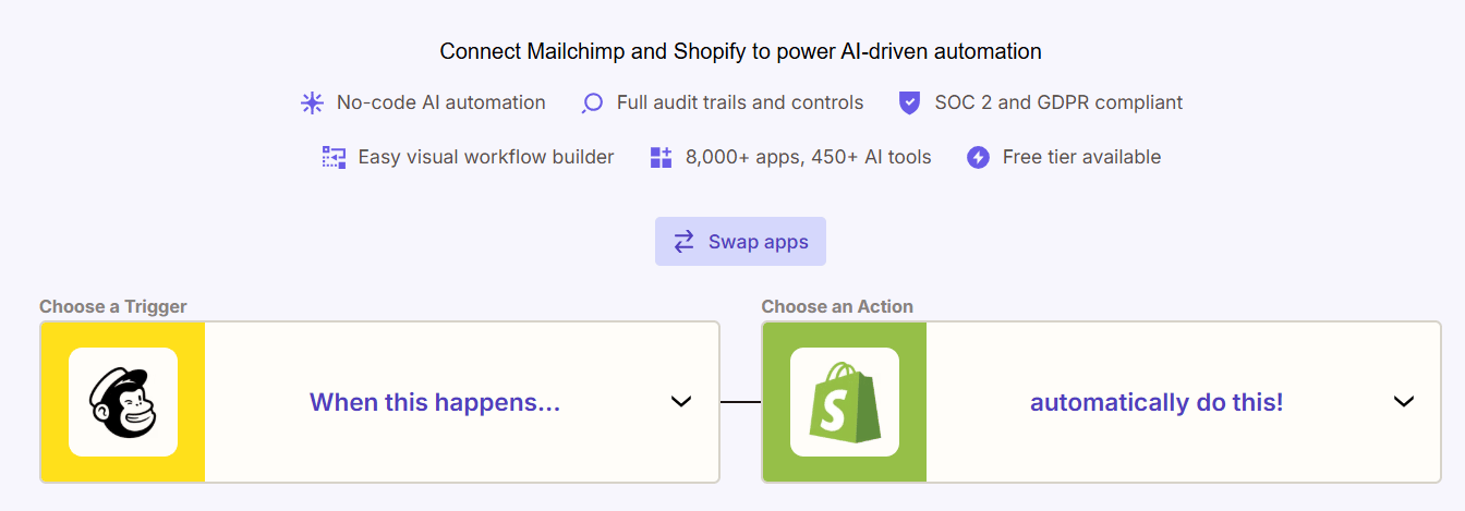A Mailchimp trigger results in an action in Shopify